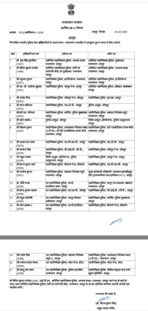 राजस्थान से इस वक्त की सबसे बड़ी खबर, प्रदेश में 21 IPS अधिकारियों के हुए तबादला, कार्मिक विभाग ने जारी किए आदेश, शरत कविराज को लगाया गया जोधपुर पुलिस कमिश्नर, एस. परिमला-महानिरीक्षक पुलिस, भ्रष्टाचार निरोधक ब्यूरो, राजस्थान, जयपुर, ओम प्रकाश-।- विशेष आयुक्त (ऑपरेशन्स), पुलिस आयुक्तालय, जयपुर, विकास कुमार- महानिरीक्षक पुलिस, एंटी नारकोटिक्स टास्क फोर्स, राजस्थान, जयपुर, अजय पाल लांबा-महानिरीक्षक पुलिस, एस.ओ.जी., जयपुर, देखें लिस्ट