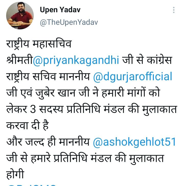 उपेन यादव ने आगे बताया कि कम्प्यूटर शिक्षकों की नियमित भर्ती किये जाने के मामले पर प्रियंका गांधी से बातचीत हुई है. यादव ने कहा की, "हम संविदा पर कंप्यूटर भर्ती निकालने का विरोध कर रहे हैं और नियमित रूप से कंप्यूटर भर्ती निकालने की मांग कर रहे. नियमित कंप्यूटर भर्ती की मांग पर सहमति जताते हुए राष्ट्रीय महासचिव प्रियंका गांधी जी ने राष्ट्रीय सचिव जुबेर खान को मुख्यमंत्री अशोक गहलोत जी या उच्च स्तर से प्रतिनिधिमंडल की वार्ता मेरे रेफरेंस से करवा कर जल्द समस्या का निस्तारण करवाने के निर्देश दिए है."
