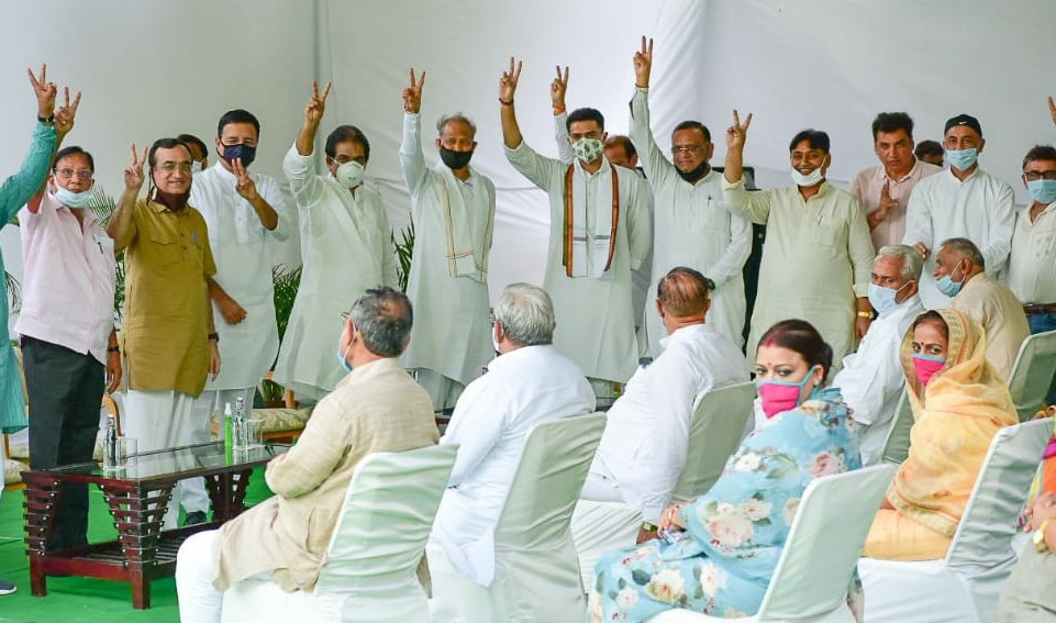 Politalks.News/Rajasthan. प्रदेश में एक महीने से ज्यादा चले सियासी घमासान का गुरुवार को मुख्यमंत्री अशोक गहलोत और सचिन पायलट की मुलाकात के साथ ही पटाक्षेप हो गया. शुक्रवार से शुरू होने वाले विधानसभा सत्र के एक दिन पहले मुख्यमंत्री आवास पर हुई कांग्रेस विधायक दल की बैठक में सचिन पायलट और उनके सभी समर्थक विधायकों ने शिरकत की. इस दौरान मुख्यमंत्री गहलोत ने पायलट का स्वागत किया. बैठक से पहले केसी वेणुगोपाल और कुछ वरिष्ठ नेताओं की मौजूदगी में सीएम गहलोत और पायलट के बीच करीब आधे घण्टे की मुलाकात हुई. इसके बाद शुरू हुई विधायक दल की बैठक में सचिन पायलट को मुख्यमंत्री गहलोत के बगल में बैठने की जगह दी गयी. विधायक दल की बैठक में सचिन पायलट ने 6 साल तक पीसीसी चीफ के रूप में मिले सहयोग के लिए सभी विधायकों का आभार जताया है. यही नहीं, राजस्‍थान में डिप्टी सीएम की जिम्मेदारी देने के लिए सोनिया गांधी और अशोक गहलोत का भी आभार जताया. बैठक में मुख्यमंत्री अशोक गहलोत ने कहा कि वह इन 19 विधायकों के बिना भी विधानसभा में बहुमत साबित कर देते, लेकिन वह खुशी नहीं मिलती. सीएम ने कहा कि अपने तो अपने होते हैं, जो हुआ उसे भूल जाओ. इसके बाद सभी विधायकों ने खड़े होकर विक्ट्री साइन के साथ दिखाई एकजुटता. मुख्यमंत्री गहलोत ने यह भी कहा कि कांग्रेस विधानसभा में विश्वासमत प्रस्ताव पेश करेगी. विधायक दल की बैठक में राजस्‍थान के पीसीसी चीफ गोविंद सिंह डोटासरा ने कहा कि अंग्रेजों की फूट डालो और राज करो की नीति है बीजेपी, इसी अंग्रेजों की नीति पर बीजेपी ने राजस्थान में षडयंत्र किया, लेकिन वो विफल हो गया. वहीं बैठक के बाद कांग्रेस के राष्ट्रीय महासचिव के.सी. वेणुगोपाल ने कहा कि सबकुछ अच्छे से हो गया. अब कांग्रेस परिवार एक साथ है, हम मिलकर भाजपा की गंदी राजनीति के खिलाफ लड़ेंगे. कल विधानसभा में कांग्रेस पार्टी एकजुटता से खड़ी होगी. विधायक दल की बैठक खत्‍म होने के बाद विधायक विश्वेंद्र सिंह ने कहा कि सब दूध का दूध पानी का पानी हो गया. हमारे पर आरोप पर आरोप लगते रहे, वे निराधार हैं. साथ ही कहा कि मैंने हमेशा कहा, मैं कांग्रेस में था और कांग्रेस में हूं. मुख्यमंत्री ने स्वागत किया और बुलाया हमें, जो भी आरोप थे उनका पर्दाफाश हो गया है. हम एक महीने इसलिए बाहर रहे कि हमारे साथ किसी प्रकार की कोई घटना नहीं हो. हमने न पहले कभी कुछ मांगा था और नहीं अब. हम जनता की सेवा के लिए आए हैं. वहीं कांग्रेस विधायक रामनारायण मीणा ने कहा कि हमें विश्वास मत लाने की जरूरत नहीं है, हम सब एक हैं. बीजेपी की हर चाल का जवाब दे सकते हैं. बीजेपी में कई तरह की गुटबाजी है. यह भी पढ़ें: सचिन पायलट खेमे की वापसी का राज – गांधी परिवार के बड़े वफ़ादार केसी वेणुगोपाल के पास इससे पहले शुक्रवार सु