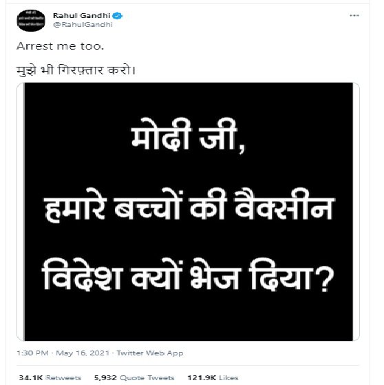 यूथ कांग्रेस प्रदेशाध्यक्ष गणेश घोघरा ने कहा, आज देश के हर नागरिक के मन में यही सवाल है कि हमारे बच्चों की वैक्सीन बाहर क्यों भेज दी? मोदीजी किस किसको गिरफ्तार करेंगे सबके मन में यही सवाल है. पूरे देश के नागरिकों को गिरफ्तार करेंगे क्या? कोरोना से पीड़ित लोगों को राहत देने की बजाय पीएम मोदी से सवाल पूछने वालों को गिरफ्तार करके केंद्र सरकार अपना लोकतंत्र विरोधी फासीवादी चरित्र दिखा रही है. देश की जनता सब देख रही है.