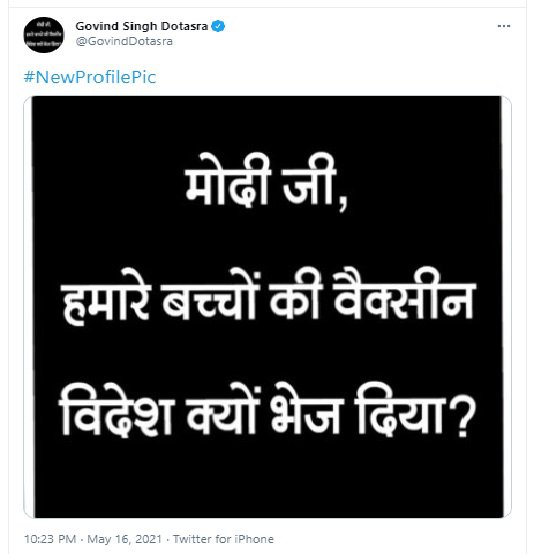 इस मामले में कांग्रेस प्रदेशाध्यक्ष गोविंद सिंह डोटासरा ने केंद्र और प्रधानमंत्री मोदी पर निशाना साधते हुए कहा- "हम शुरु से ही कहते आए हैं कि केंद्र में बैठे लोगों, भाजपा के नेताओं का लोकतांत्रिक मूल्यों परंपराओं में कतई विश्वास नहीं है. क्या प्रधानमंत्री से सवाल पूछना ही गुनाह हो गया क्या? प्रधानमंत्री से इतना सा ही तो पूछा है कि हमारे बच्चों की वैक्सीन बाहर क्यों भेज दी?