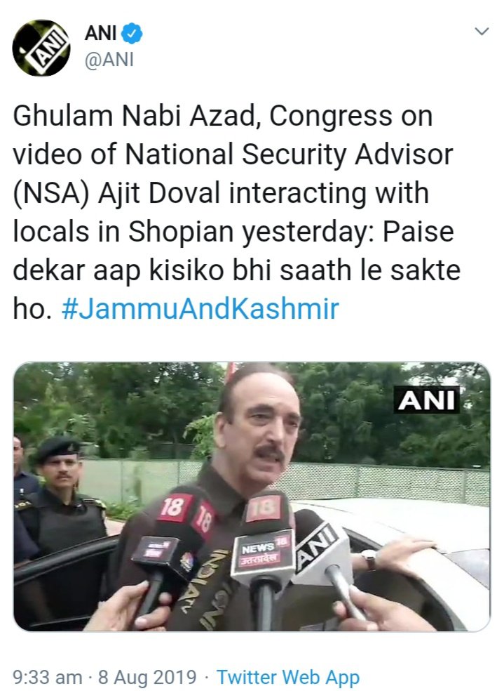 कांग्रेस पार्टी के वरिष्ठ नेता और राज्यसभा में नेता प्रतिपक्ष गुलाम नबी आजाद ने गुरुवार को राष्ट्रीय सुरक्षा सलाहकार (एनएसए) अजित डोभाल की कश्मीरियों के साथ मुलाकात को लेकर एक विवादित बयान दिया. उन्होंने कश्मीरियों के साथ डोभाल के खाना खाने के वीडियो पर बयान देते हुए कहा कि "पैसे देकर आप किसी को भी साथ ले सकते हो". दरअसल, जम्मू कश्मीर से धारा 370 हटने के बाद बुधवार को एनएसए अजित डोभाल सुरक्षा का जायजा लेने कश्मीर पहुंचे थे. यहां अजीत डोभाल ने आम कश्मीरियों के साथ आतंक का गढ़ माने जाने वाले शोपियां में सडक के किनारे खड़े होकर खाना खाया. बातचीत में लोगों को भरोसा दिलाया, उनका हित सुरक्षित है. इस पर आंच नहीं आने दी जाएगी. शोपियां में एक मोहल्ले में उन्होंने दुकान की सीढ़ियों पर बैठकर आम लोगों के साथ खाना खाया. उन्हें बताया, यह फैसला सरकार ने कश्मीर के लोगों के हित में किया है, चिंता करने की जरूरत नहीं है. वीडियो में वह कहते सुने जा रहे हैं कि सब लोग आराम से रहें, ऊपर वाले की मेहरबानी है, सब कुछ अच्छा होगा. आपकी हिफाजत और सलामती हम लोगों का प्रयास है, यहां खुशहाली आएगी, आप और आपके बच्चे चैन से रह सकें, अच्छे नागरिक बनें यही प्रयास है, इस दौरान जम्मू-कश्मीर के डीजीपी दिलबाग सिंह भी अजीत डोभाल के साथ मौजूद रहे. बता दें, जम्मू-कश्मीर को केंद्र शासित प्रदेश बनाए जाने और धारा 370 को कमजोर करने का कांग्रेस पार्टी ने विरोध किया है. राज्यसभा में विपक्ष के नेता गुलाम नबी आजाद ने इस विरोध की अगुवाई की है. इस बीच गुलाम नबी आजाद गुरुवार को कश्मीर के कांग्रेस नेताओं के साथ अनुच्छेद 370 को हटाने, जम्मू-कश्मीर को केंद्र प्रशासित बनाने सहित अन्य मुद्दों पर बैठक करने श्रीनगर पहुंचे जहां खबर लिखे जाने तक उन्हें श्रीनगर एयरपोर्ट पर ही रोक दिया गया. गुलाम नबी आजाद के साथ जम्मू कश्मीर कांग्रेस प्रदेशाध्यक्ष भी को एयरपोर्ट पर ही रोक गया. कश्मीर जाने से पहले आजाद ने अजित डोभाल के वीडियो पर निशाना साधा है, उन्होंने कहा कि आप पैसा देकर किसी को भी साथ ला सकते हैं. अजित डोभाल के इस वीडियो को गुलाम नबी आजाद ने अजित डोभाल और केंद्र सरकार का ड्रामा बताया है. उन्होंने कहा कि एनडीए सरकार का फैसला काफी शर्मनाक है. उन्होंने एक राज्य का अस्तित्व ही खत्म कर दिया है. भारतीय इतिहास में पहली बार ऐसा हुआ है कि किसी राज्य को केंद्र शासित प्रदेश बना दिया हो और वहां पर कर्फ्यू लगा हो. गुलाम नबी आजाद के इस बयान पर बीजेपी में जबरदस्त आक्रोश है. गुलाम नबी के बयान पर बीजेपी शाहनवाज हुसैन ने कहा है कि आजाद को इस बयान पर माफी मांगनी चाहिए, क्योंकि उनके ऐसे बयान का पाकिस्तान गलत फायदा उठाने की कोशिश करेगा. हुसैन ने कहा, 'अजित डोभाल वहां पर लोगों से मिलज