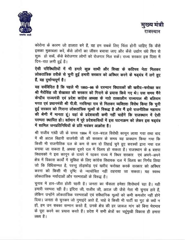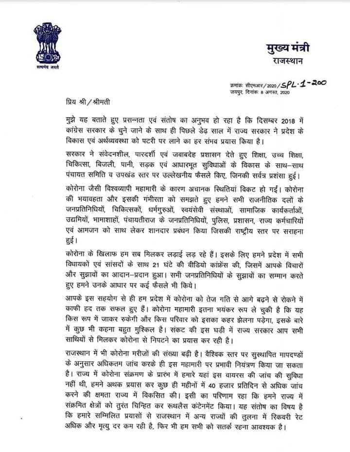 तीन पेज के पत्र में मुख्यमंत्री अशोक गहलोत ने लिखा कि कोरोना से बने हालातों की हम सबको चिंता करनी चाहिए. रोजगार सहित दूसरे कई मामले हैं, जिन पर काम करना चाहिए. ऐसी विकट संकट की स्थिति में कुछ लोग जनता द्वारा चुनी हुई सरकार को अस्थिर कर कोरोना की लड़ाई को कमजोर कर रहे हैं.