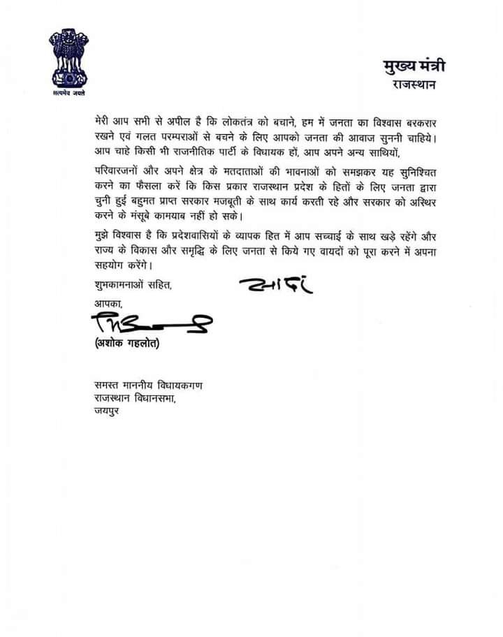 Politalks.News/Rajasthan. राजस्थान के सियासी घमासान के बीच मुख्यमंत्री अशोक गहलोत ने राजस्थान के सभी 200 विधायकों को पत्र लिखकर लोकतंत्र को बचाने की अपील की है. सीएम गहलोत ने विधायकों से कहा कि वो अपनी आत्मा की आवाज सुनकर सही और गलत का निर्णय करें. लोकतांत्रिक तरीकों से चुनी हुई सरकारों को गिराना अच्छी परंपरा नहीं है. सभी को जनता की आवाज सुननी चाहिए. गलत परंपराओं से बचते हुए जनता का विश्वास बरकरार रखना चाहिए. पत्र के आखिरी में लिखा कि विधायकों को अपने परिवार और क्षेत्र के मतदाताओं की भावनाओं का समझकर यह सुनिश्चित करना चाहिए कि राजस्थान के हितों के लिए बहुमत प्राप्त सरकार अपना काम करती रहे. वहीं सरकार को अस्थिर करने के मंसूबी कामयाब नहीं हो सकें.