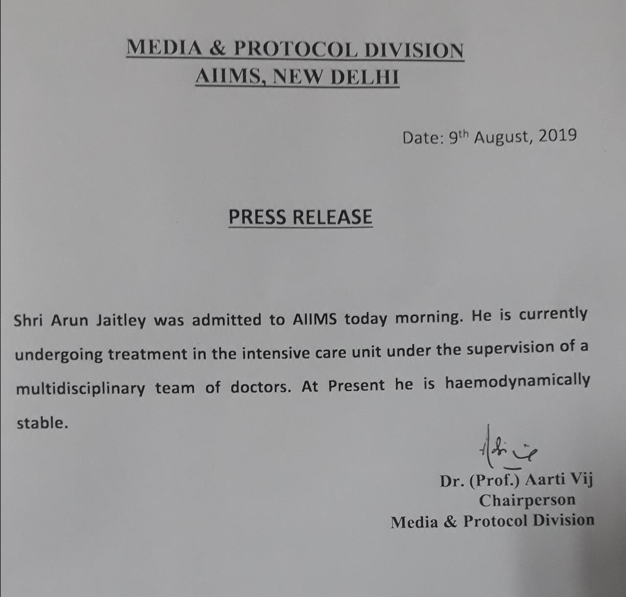 सांस लेने में तकलीफ के बाद अरुण जेटली एम्स के आईसीयू में भर्ती, पीएम समेत कई नेता पहुंचे एम्स