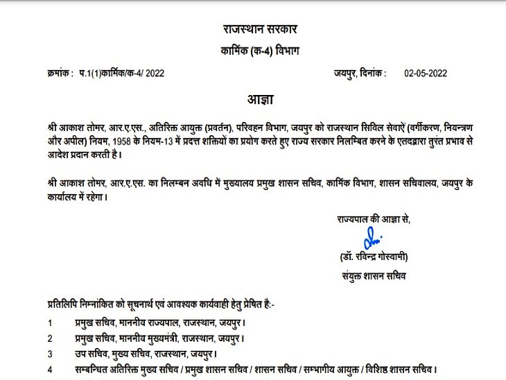 अब सरकारी आदेश में हुई इस बड़ी गलती के कारण मचे सियासी बवाल के कुछ घण्टों बाद ही गहलोत सरकार ने मामले की गम्भीरता को देखते हुए आरएएस आकाश तोमर को निलंबित कर दिया. कार्मिक विभाग ने अपने आदेशों में कहा कि आकाश तोमर. आर.ए.एस. अतिरिक्त आयुक्त (प्रवर्तन), परिवहन विभाग, जयपुर को राजस्थान सिविल सेवाएं (वर्गीकरण, नियन्त्रण और अपील) नियम, 1958 के नियम-13 में प्रदत्त शक्तियों का प्रयोग करते हुए राज्य सरकार निलंबित करने का ततकाल प्रभाव से आदेश जारी करती है. आकाश तोमर निलम्बन अवधि में मुख्यालय प्रमुख शासन सचिव, कार्मिक विभाग, शासन सचिवालय, जयपुर में अपनी उपस्थिति दर्ज कराएंगे.