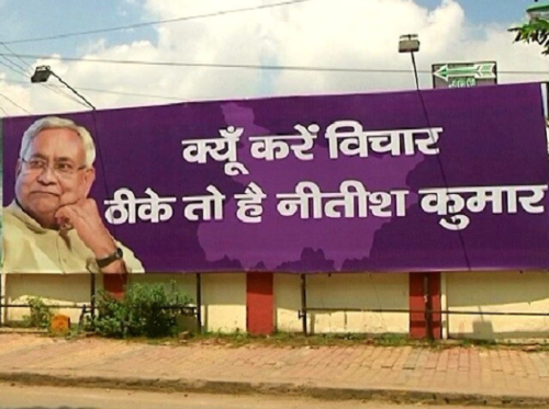 बिहार में सत्तारूढ़ पार्टी जनता दल युनाटेड (JDU) और विपक्ष में बैठी प्रदेश के पूर्व मुख्यमंत्री लालू प्रसाद यादव की पार्टी राष्ट्रीय जनता दल (RJD) के बीच अब 'पोस्टर वॉर' शुरू हो गया है. इसकी शुरूआत की मुख्यमंत्री नीतीश कुमार ने. नीतीश कुमार के पुराने चुनावी रणनीतिकार प्रशांत किशोर के जाने बाद JDU ने अपना स्लोगन बदल दिया है. अब उनकी पार्टी JDU के ऑफिस के बाहर एक नया पोस्टर लगा है जिसपर लिखा है, 'क्यों करें विचार, ठीके तो है नीतीश कुमार'.