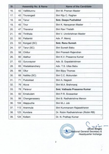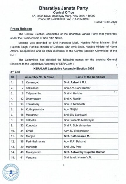 भाजपा ने केरल विधानसभा चुनाव के लिए 39 उम्मीदवारों की दूसरी लिस्ट की जारी, देखें सूची