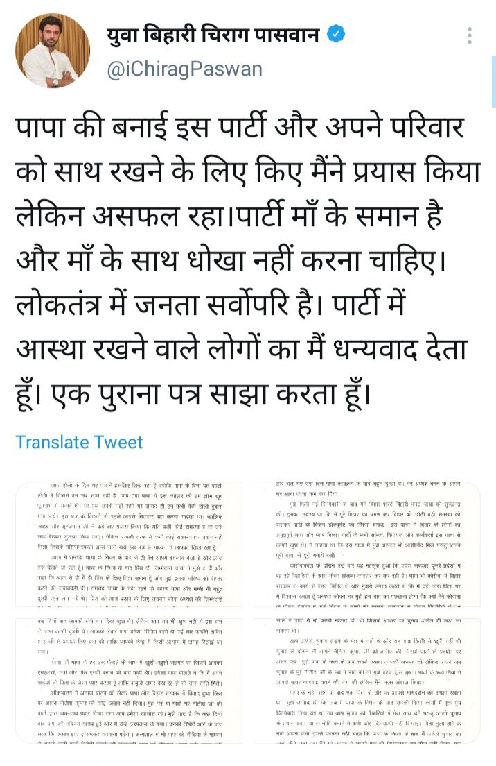 इस सारे सियासी घमासान बीच पहली बार चिराग पासवान ने अपनी चुप्पी तोड़ी है. चिराग ने एक ट्वीट कर पशुपति पारस को लिखे कुछ पुराने पत्र साझा किए. इसके साथ ही चिराग ने लिखा कि पापा की बनाई इस पार्टी और अपने परिवार को साथ रखने के लिए मैंने प्रयास किए लेकिन असफल रहा. पार्टी मां के समान है और मां के साथ धोखा नहीं करना चाहिए. लोकतंत्र में जनता ही सर्वोपरि है. चिराग ने लिखा कि पार्टी में आस्था रखने वाले लोगों का मैं धन्यवाद देता हूं.