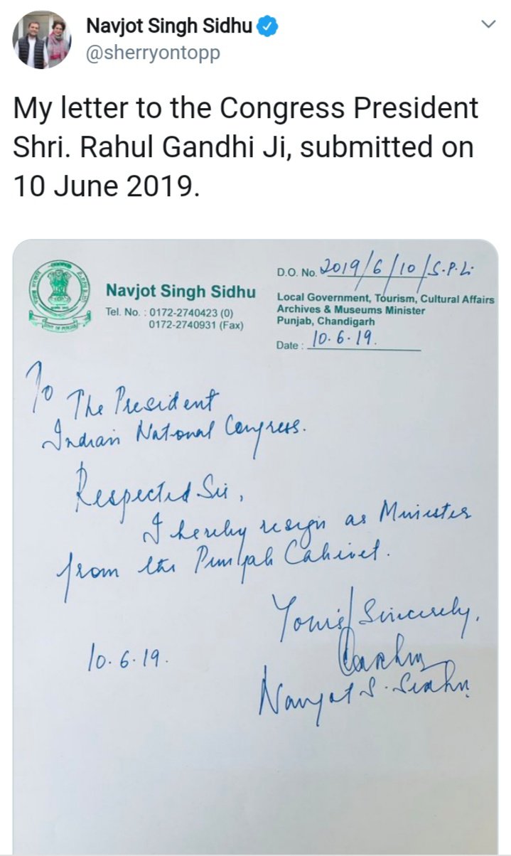 पंजाब के कैबिनेट मंत्री नवजोत सिंह सिद्धू ने अपने पद से इस्तीफा दे दिया है. सिद्धू ने लगभग एक महीने व पांच दिन पहले 10 जून को अपना इस्तीफा राहुल गांधी को सौंप दिया था लेकिन इसका खुलासा आज किया है. सिद्धू ने ट्विट कर रविवार को यह जानकारी सार्वजनिक की, उन्होंने ट्वीट कर यह भी बताया कि अब वे अपना इस्तीफा मुख्यमंत्री कैप्टन अमरिंदर सिंह को भेज रहे हैं.
