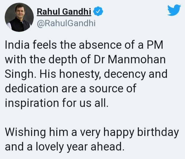 पूर्व पीएम मनमोहन सिंह के जन्मदिन पर उनकी प्रशंसा कर कांग्रेस के पूर्व अध्यक्ष राहुल गांधी ने अप्रत्यक्ष रूप से प्रधानमंत्री नरेंद्र मोदी पर निशाना साधा.' इस मौके पर राहुल गांधी ने ट्वीट करते हुए लिखा कि