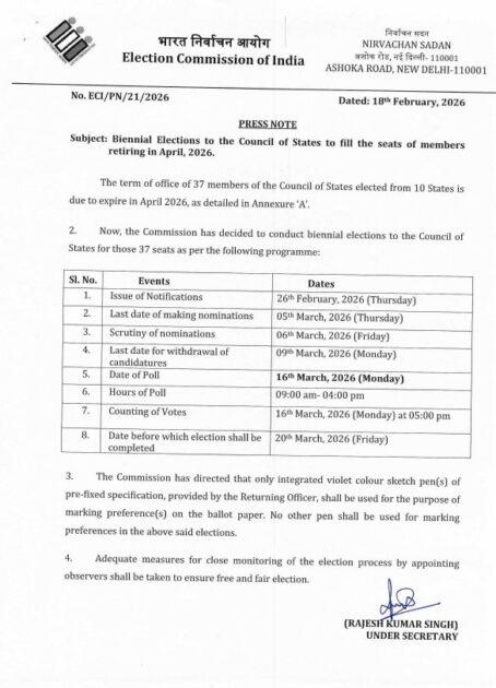 इस वक्त की सबसे बड़ी खबर, राज्यसभा की 37 सीटों पर चुनाव की तारीखों का हुआ ऐलान, 37 सीटों के लिए 16 मार्च को कराया जाएगा चुनाव, महाराष्ट्र की सात, पश्चिम बंगाल और बिहार की 5-5 सीटों पर कराया जाएगा चुनाव, तमिलनाडु की 6 सीटों पर कराया जाएगा चुनाव, शरद पवार, रामदास अठावले, कणिमोझी, तिरुचि शिवा, राज्यसभा के उपसभापति हरिवंश का कार्यकाल 2 अप्रैल को हो रहा है समाप्त, राज्यसभा की 37 सीटों के लिए 26 फरवरी को जारी होगा नोटिफिकेशन, 5 मार्च तक कैंडिडेट भर पाएंगे नामांकन, 6 मार्च को नामंकन पत्रों की होगी जांच, 9 मार्च तक कैंडिडेट ले सकते हैं नामांकन वापस,16 मार्च को होगी वोटिंग, सुबह 9 से शाम 4 बजे तक होगी वोटिंग, वही इसी दिन शाम 5 बजे से होगी वोटों की गिनती, 20 मार्च तक चुनाव की पूरी प्रक्रिया हो जाएगी खत्म