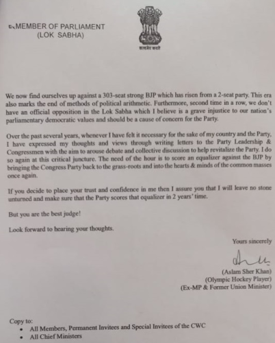 लोकसभा चुनाव में करारी और शर्मनाक हार के बाद से ही कांग्रेस में किसी तूफान से पहले का सा सन्नाटा छाया है. वहीं पार्टी अध्यक्ष राहुल गांधी की अपने पद से इस्तीफा देने और नए अध्यक्ष की तलाश करने का कहने के बाद से तो यह सन्नाटा और भयंकर दिख रहा है. इसी बीच पूर्व केंद्रीय मंत्री और हॉकी में ओलंपिक पदक विजेता असलम शेर खान ने कांग्रेस अध्यक्ष राहुल गांधी को एक पत्र लिखकर अध्यक्ष पद देने की गुहार लगाई है. साथ ही उन्होंने कहा कि पार्टी को फिर से राष्ट्रवाद से जोड़ना जरूरी है.