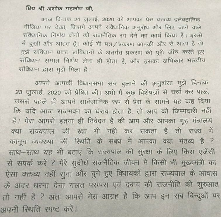 सीएम गहलोत के मीडिया में जारी बयान और कांग्रेस विधायकों की नारेबाजी से नाराज होकर राज्यपाल कलराज मिश्र ने सीएम गहलोत को पत्र लिखते हुए कहा कि आपका प्रेस वक्तव्य इलेक्ट्रॉनिक मीडिया पर देखा, जिसमें आपने संवैधानिक अनुरोध और लिए जाने वाले संवैधानिक निर्णय दोनों को राजनीतिक रंग देने का कार्य किया है. इससे मैं दुखी और आहत हूं. कोई भी पत्र आप की ओर से आता है तो मुझे संविधान प्रदत्त संविधान के अंतर्गत प्रकरण की पूरी जांच करते हुए संविधान सम्मत निर्णय लेना ही होता है और इसका अधिकार भारतीय संविधान द्वारा मुझे मिला है.