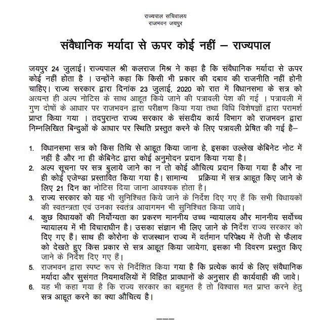 राज्यपाल कलराज मिश्र ने कहा है कि संवैधानिक मर्यादा से ऊपर कोई नहीं होता है. किसी भी प्रकार की दबाव की राजनीति नहीं होनी चाहिए. राज्य सरकार द्वारा दिनांक 23 जुलाई, 2020 को रात में विधानसभा के सत्र को अत्यन्त ही अल्प नोटिस के साथ आहूत किये जाने की पत्रावली पेश की गई. पत्रावली में गुण दोषों के आधार पर राजभवन द्वारा परीक्षण किया गया व विधि विशेषज्ञों द्वारा परामर्श प्राप्त किया गया. इसके पश्चात राज्य सरकार के संसदीय कार्य विभाग को राजभवन द्वारा निम्नलिखित बिन्दुओं के आधार पर स्थिति प्रस्तुत करने के लिए पत्रावली प्रेषित की गई है.