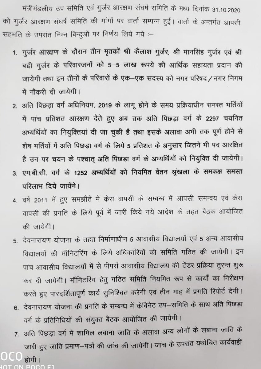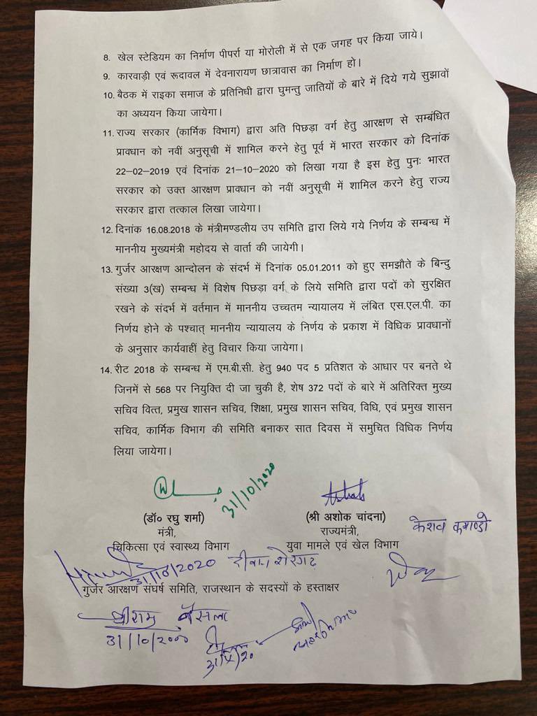 प्रेस को सम्बोधित करते हुए मंत्री रघु शर्मा ने कहा कि इस बैठक में गुर्जर संघर्ष समिति के 4 दर्जन सदस्य कैबिनेट सब कमेटी से वार्ता के लिए जयपुर आए थे. ह्मारीबशुक्रवार रात भी वार्ता हुई थी और आज भी लगभग सात घण्टे चली बैठक के बाद हमारी 14 बिंदुओं पर सहमति बनी है. जिसके अनुसार- पहले हुए गुर्जर आंदोलन में मारे गए तीन 3 मृतकों के परिजनों को 5-5लाख की सहायता दी जाएगी. इसके साथ ही इनके परिवार के 1-1 सदस्य को नगर निगम, नगर परिषद में नौकरी भी दी जाएगी. रघु शर्मा ने आगे कहा कि प्रक्रियाधीन सभी भर्तियों में आरक्षण देते हुए नियुक्ति दी जा चुकी है. 2297 चयनित अभ्यर्थियों को नियुक्ति दी जा चुकी है. अब जितने भी पद आरक्षित उनमें MBC अभ्यर्थियों को नियुक्ति दी जाएगी.