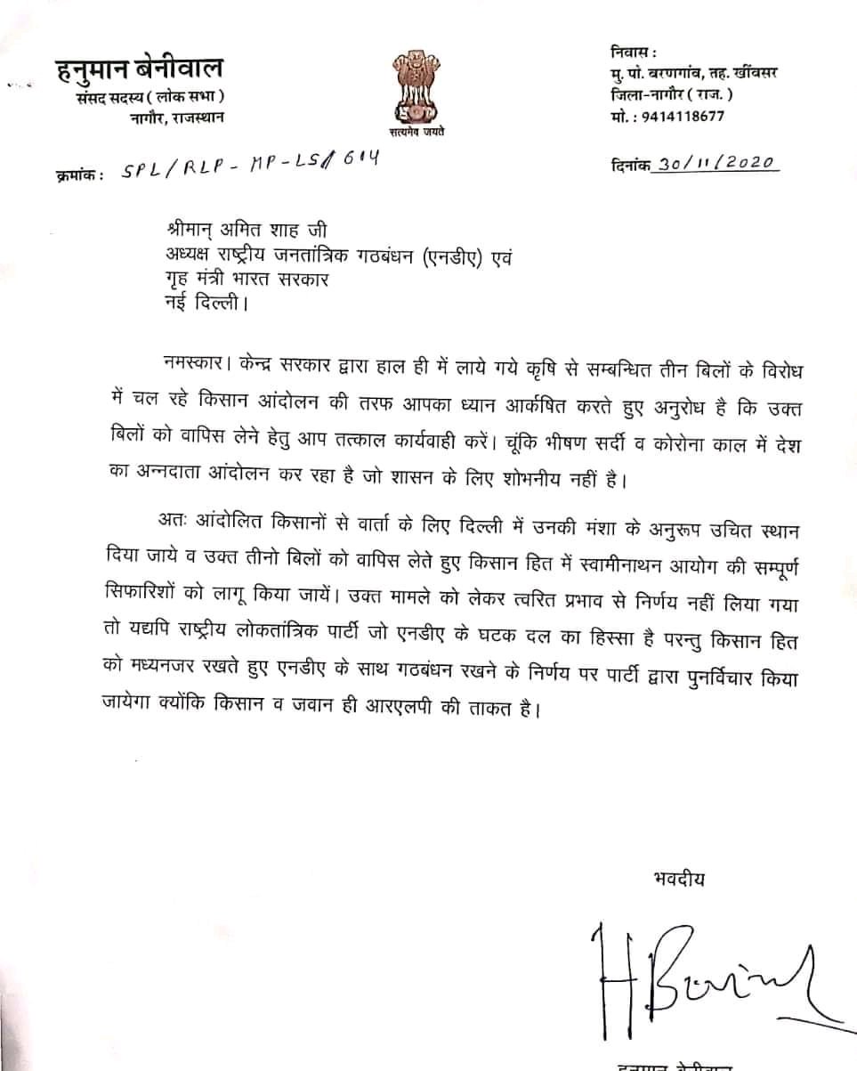 बेनीवाल ने लिखा कि, "केन्द्र सरकार द्वारा हाल ही में लाये गये कृषि से सम्बन्धित तीन बिलों के विरोध में चल रहे किसान आंदोलन की तरफ आपका ध्यान आर्कषित करते हुए अनुरोध है कि उक्त बिलों को वापिस लेने हेतु आप तत्काल कार्यवाही करें. चूंकि भीषण सर्दी व कोरोना काल में देश का अन्नदाता आंदोलन कर रहा है जो शासन के लिए शोभनीय नहीं है."
