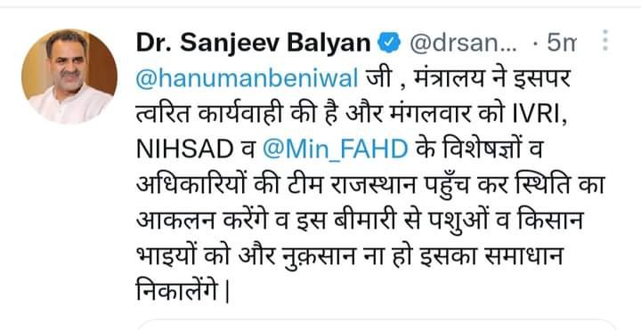 यही नहीं सांसद हनुमान बेनीवाल ने भारत सरकार के पशुपालन और डेयरी राज्य मंत्री डॉक्टर संजीव बाल्यान को भी ट्वीट किया और केंद्र के स्तर से भी एक विशेष टीम राजस्थान के नागौर सहित अन्य जिलों में भेजने की मांग की है. सांसद बेनीवाल ने कहा की केंद्र की टीम राज्य के पशुपालन विभाग के साथ समन्वय स्थापित करके कार्य करे ताकि इस गंभीर बीमारी से समय पर निपटा जा सके. सांसद बेनीवाल के ट्वीट पर त्वरित प्रतिक्रिया करते हुए रिट्वीट कर कहा कि हनुमान बेनीवाल जी मंत्रालय ने इस पर कार्यवाही की है और मंगलवार को विशेषज्ञों और अधिकारियों की टीम राजस्थान पहुंचकर स्थिति का आकलन करेंगे और अब आगे इस बीमारी की वजह से पशुओं और किसानों को और ज्यादा नुकसान न हो इसका समाधान निकालेंगे.