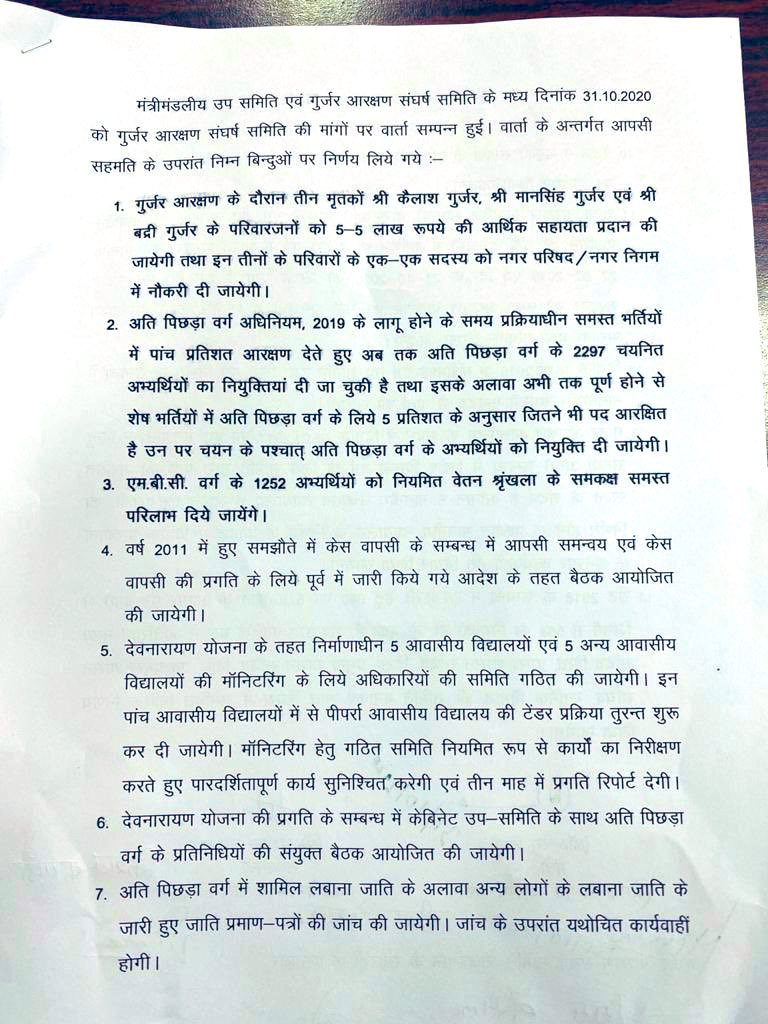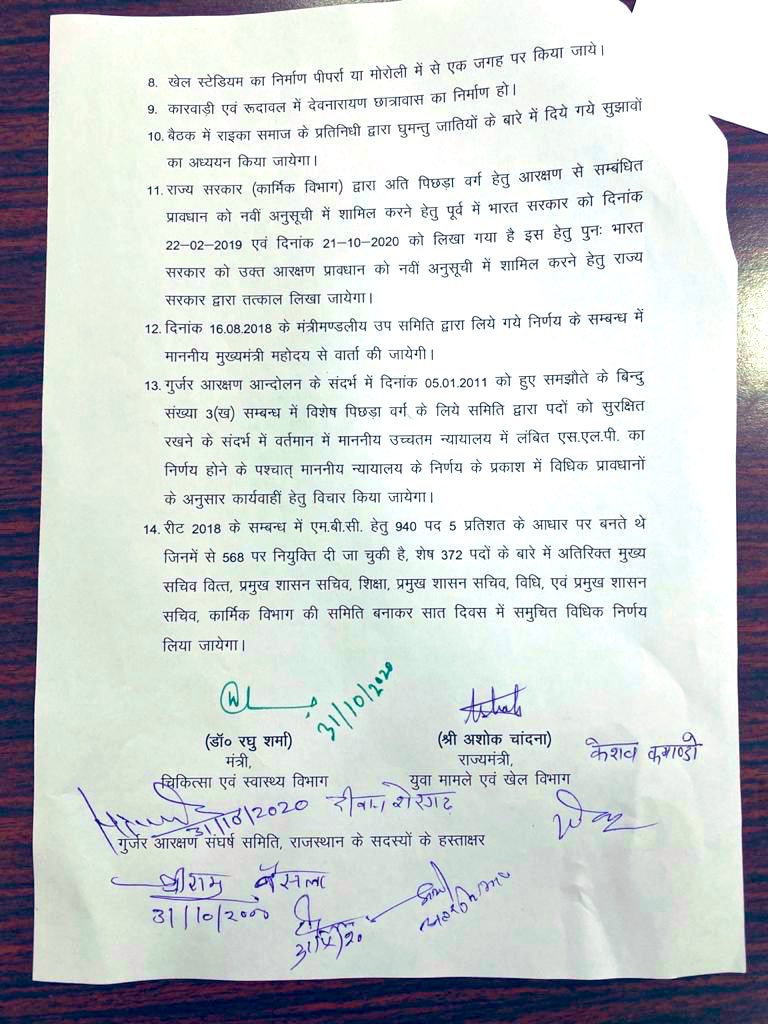 अपने तीसरे ट्वीट में हिम्मत सिंह गुर्जर ने समाज के युवाओं से किया वादा करते हुए कहा- सरकार व 41 गुर्जर प्रतिनिधियों के साथ हुए 31/10/20 समझौते के बिन्दुवार पालना सुनिश्चित होगी ये मैं #MBC के युवाओं से करता हूं वादा, समझौते के बिन्दु संख्या 12 व 14 की पालनार्थ मा0 सीएम अशोक गहलोत जी, सब कमेटी सदस्य रघु शर्मा जी और अशोक चांदना जी से जल्द की जाएगी मुलाक़ात.’