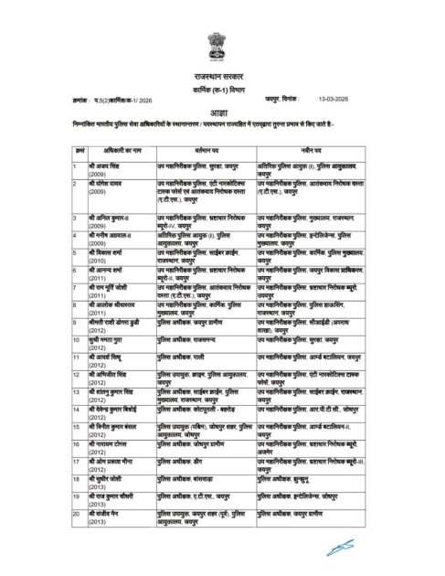 राजस्थान पुलिस महकमे में हुआ बड़ा फेरबदल, 64 IPS अफसरों के हुए तबादले, प्रदेश के अधिकांश जिलों के बदले गए पुलिस अधीक्षक, सभी जिलों से हटाए गए डीआईजी, मृदुल कच्छावा बने बीकानेर के एसपी, भिवाड़ी एसपी ब्रजेश ज्योति उपाध्याय को अतिरिक्त चार्ज, एसपी खैरथल तिजारा के पद का मिला अतिरिक्त चार्ज, देखिए पूरी लिस्ट..