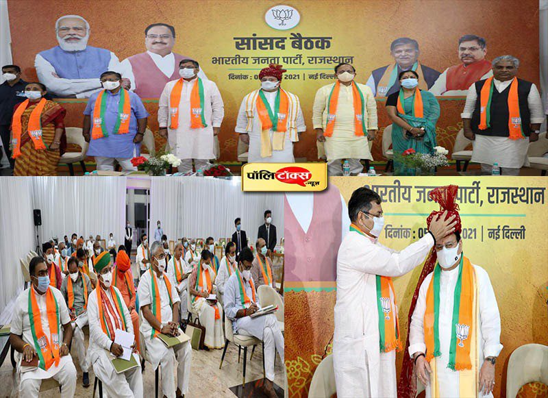 Politalks.News/Rajasthan. बीजेपी केंद्रीय आलाकमान ने केंद्र की सत्ता व प्रदेश संगठन में तालमेल बढ़ाने और पार्टी में एकजुटता का संदेश देने के लिए गुरुवार को दिल्ली के वेस्टर्न कोर्ट में राजस्थान के सभी सांसदाें और पार्टी पदाधिकारियों की बैठक ली. बीजेपी के राष्ट्रीय अध्यक्ष जेपी नड्डा ने इन सभी सांसदाें, प्रदेश संगठन के पदाधिकारियाें को प्रदेश से जुड़े राष्ट्रीय पदाधिकारियाें की माैजूदगी में पार्टी की आगामी रणनीति से अवगत कराया. दी दौरान प्रदेश भाजपा अध्यक्ष सतीश पूनियां ने जेपी नड्डा का राजस्थानी साफा पहनाकर स्वागत किया.