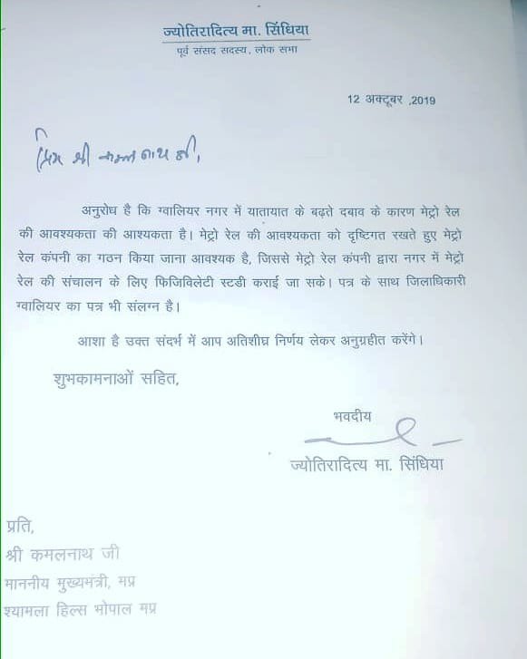 बता दें, पूर्व केन्द्रीय मंत्री ज्योतिरादित्य सिंधिया (Jyotiraditya Scindia) ने हाल ही में ग्वालियर दौरे के दौरान शहर में बढ़ते ट्रैफिक को देखते हुए लोगों की मांग पर मुख्यमंत्री कमलनाथ को पत्र लिख कर कहा है कि ग्वालियर में यातायात के बढ़ते दबाव के कारण मेट्रो रेल की आवश्यकता है. मेट्रो रेल की आवश्यकता को ध्यान में रखते हुए ग्वालियर में मेट्रो रेल कंपनी का गठन किया जाना आवश्यक है, जिससे मेट्रो रेल कंपनी द्वारा नगर में मेट्रो रेल के संचालन के लिए फिजिबिलेटी स्टडी कराई जा सके.