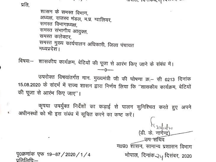 Politalks.News/MadhyaPradesh. मध्य प्रदेश की शिवराज सरकार में अब सभी सरकारी कार्यक्रमों की शुरूआत कन्या (बेटी) की पूजा से होगी. सामान्य प्रशासन विभाग ने गुरुवार को इस संबंध में आदेश जारी कर दिए हैं. सभी विभाग प्रमुख, विभागाध्यक्ष, संभाग आयुक्त, कलेक्टर और मुख्य कार्यपालन अधिकारी जिला पंचायत से आदेश का कड़ाई से पालन करने को कहा गया है. विभाग द्वारा जारी आदेश में लिखा गया है कि मध्य प्रदेश के मुख्यमंत्री शिवराज सिंह चौहान की घोषणा क्रमांक C-0213 दिनांक 15 अगस्त 2020 के संदर्भ में मध्य प्रदेश राज्य शासन द्वारा निर्णय लिया गया है कि सभी शासकीय कार्यक्रम बेटियों की पूजा से आरंभ किए जाएं.