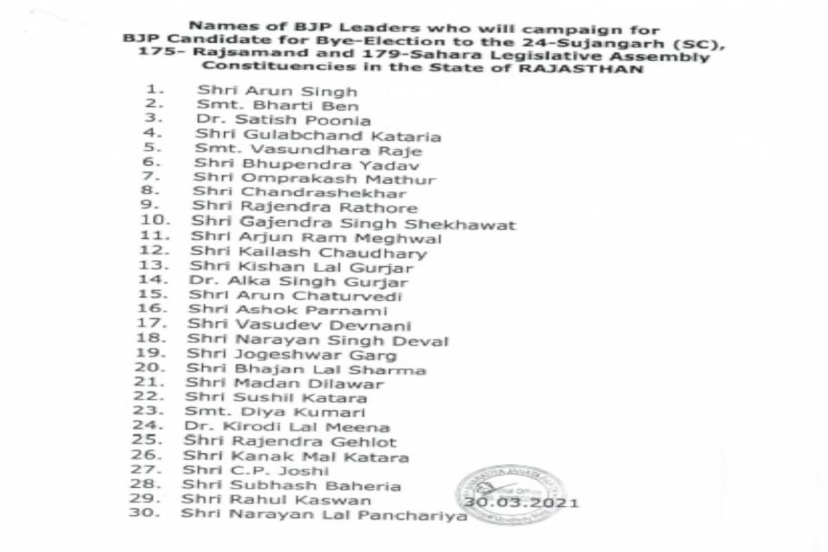 बीजेपी द्वारा जारी की गई स्टार प्रचारकों की इस सूची में प्रदेश प्रभारी और राष्ट्रीय महामंत्री अरुण सिंह, सह प्रभारी भारती बेन शियाल, प्रदेश अध्यक्ष सतीश पूनियां, नेता प्रतिपक्ष गुलाबचंद कटारिया, पूर्व मुख्यमंत्री और बीजेपी की राष्ट्रीय उपाध्यक्ष वसुंधरा राजे, राष्ट्रीय महामंत्री भूपेंद्र यादव, राज्यसभा सांसद ओम माथुर, प्रदेश संगठन महामंत्री चंद्रशेखर, प्रतिपक्ष के उपनेता राजेंद्र राठौड़, केंद्रीय मंत्री गजेंद्र सिंह शेखावत, अर्जुन राम मेघवाल और कैलाश चौधरी, बीजेपी की राष्ट्रीय मंत्री अलका गुर्जर को भी इस लिस्ट में शामिल किया गया है. पूर्व प्रदेश अध्यक्षों की बात करें तो इसमें अरुण चतुर्वेदी और अशोक परनामी दोनों को भी स्टार प्रचारकों में जगह दी गई है.