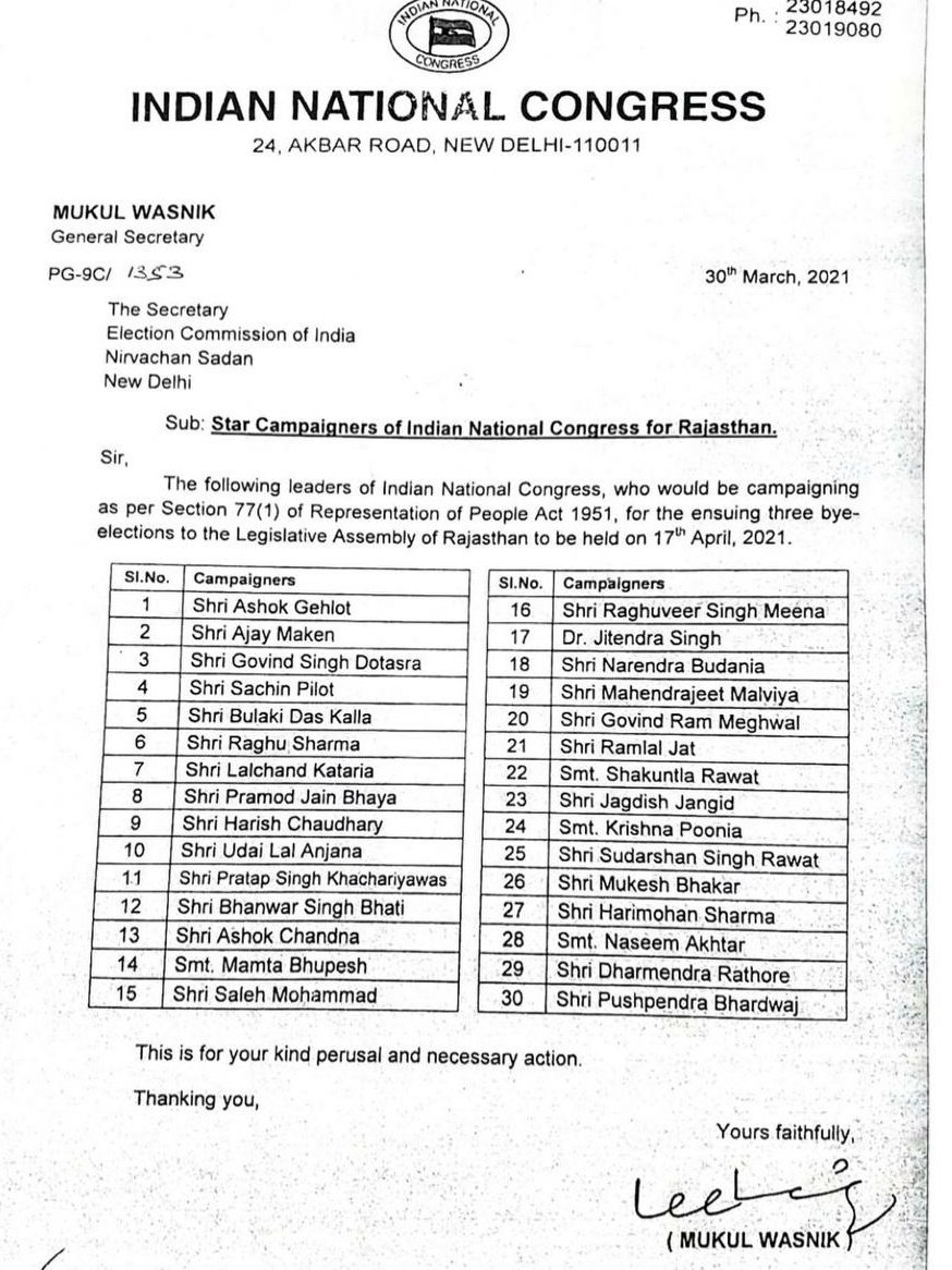 कांग्रेस द्वारा केंद्रीय निर्वाचन आयोग को भेजी गई स्टार प्रचारकों की सूची में मुख्यमंत्री अशोक गहलोत, प्रदेश प्रभारी अजय माकन, पीसीसी चीफ गोविंद सिंह डोटासरा और पूर्व डिप्टी सीएम सचिन पायलट के अलावा जिन 11 मंत्रियों के नाम स्टार प्रचारकों की सूची में हैं उनमें बीडी कल्ला, रघु शर्मा, लालचंद कटारिया, प्रमोद जैन भाया, हरीश चौधरी, उदयलाल आंजना, प्रताप सिंह खाचरियावास, भंवर सिंह भाटी, अशोक चांदना, ममता भूपेश और सालेह मोहम्मद शामिल हैं. वहीं विधायकों की बात करें तो जितेंद्र सिंह, नरेंद्र बुडानिया, महेंद्रजीत सिंह मालवीय, गोविंदराम मेघवाल, रामलाल जाट, शकुंतला रावत, जगदीश जांगिड़, कृष्णा पूनिया, सुदर्शन सिंह रावत और मुकेश भाकर का नाम सूची में शामिल है. इसी तरह दूसरे कांग्रेस नेताओं में रघुवीर सिंह मीणा, नसीम अख्तर, धर्मेंद्र राठौड़ और पुष्पेंद्र भारद्वाज का नाम भी स्टार प्रचारकों की सूची में शामिल है.