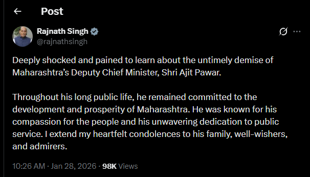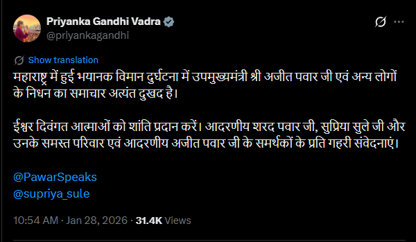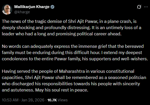 महाराष्ट्र की राजनीति से जुडी बड़ी खबर, प्रदेश के उपमुख्यमंत्री और एनसीपी के वरिष्ठ नेता अजित पवार का हुआ निधन, विमान हादसे में अजित पवार का हुआ निधन, 66 वर्षीय अजीत पवार मुंबई से चार्टर्ड प्लेन के जरिए बारामती जा रहे थे, जहां उन्हें पंचायत चुनाव के सिलसिले में चार सभाओं को संबोधित करना था, सुबह करीब 8.45 बजे बारामती एयरपोर्ट पर लैंडिंग के दौरान विमान रनवे से फिसल गया और क्रैश हो गया, वही उनके निधन पर देश के दिग्गजों ने जताया दुःख, पीएम मोदी, अमित शाह, राजनाथ सिंह, राहुल गांधी, प्रियंका गांधी, मल्लिकार्जुन खरगे, देवेंद्र फडणवीस समेत देश के कई दिग्गजों ने जताया दुःख, पीएम मोदी ने कहा- श्री अजीत पवार जी जननेता थे, जिनका जमीनी स्तर पर गहरा जुड़ाव था। महाराष्ट्र की जनता की सेवा में अग्रणी भूमिका निभाने वाले एक कर्मठ व्यक्ति के रूप में उनका व्यापक सम्मान था, प्रशासनिक मामलों की उनकी समझ और गरीबों एवं वंचितों को सशक्त बनाने का उनका जज़्बा भी सराहनीय था, उनका असामयिक निधन अत्यंत दुखद और स्तब्ध कर देने वाला है, उनके परिवार और अनगिनत प्रशंसकों के प्रति हमारी संवेदनाएं। ओम शांति, राहुल गांधी ने कहा- महाराष्ट्र के उप मुख्यमंत्री श्री अजित पवार जी और उनके सहयात्रियों की आज हवाई जहाज दुर्घटना में निधन का समाचार अत्यंत पीड़ादायक है, इस शोक के पल में महाराष्ट्र की जनता के साथ हूं, समस्त पवार परिवार और प्रियजनों को इस दुख की घड़ी में अपनी संवेदनाएं व्यक्त करता हूं, देखें बाकि दिग्गजों ने क्या कहा?