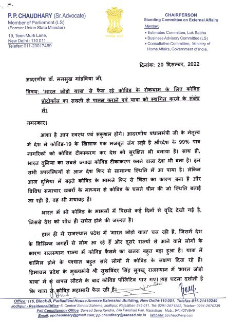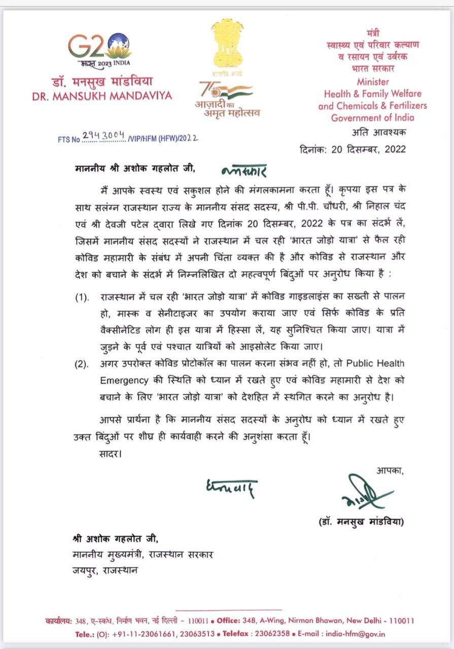 गौरतलब है कि केंद्रीय स्वास्थ्य मंत्री डॉ. मनसुख मांडविया ने कांग्रेस नेता राहुल गांधी और राजस्थान के मुख्यमंत्री अशोक गहलोत को पत्र लिखा था. जिसमें उन्होंने राजस्थान के सांसद पीपी चौधरी की ओर से लिखे गए पत्र का संदर्भ रखा. पत्र में दो महत्वपूर्ण बिंदुओं पर अनुरोध किया गया है, जिसमें पहला राजस्थान में चल रही 'भारत जोड़ो यात्रा' में कोविड गाइडलाइंस का सख्ती से पालन, मास्क व सैनिटाइजर के इस्तेमाल की बातें कही गई. इसके साथ ही कहा गया कि इस यात्रा में केवल वैक्सीनेटेड लोगों को ही हिस्सा लेने की अनुमति दी जाए. इसके इतर यात्रा में जुड़ने के पूर्व व पश्चात यात्रियों को आइसोलेट किया जाए. साथ ही दूसरे बिंदु में लिखा गया कि अगर उपरोक्त कोविड प्रोटोकॉल का पालन करना संभव नहीं हो तो Public Health Emergency की स्थिति को ध्यान में रखते हुए कोविड महामारी से देश को बचाने के लिए 'भारत जोड़ो यात्रा' को देशहित में स्थगित करें. केंद्रीय मंत्री मांडविया के पत्र के बाद से कांग्रेस मोदी सरकार पर हमलावर है.