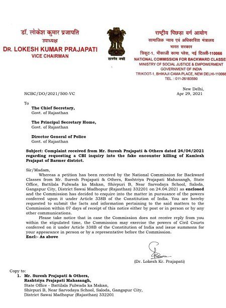Politalks.News/Rajasthan. हाल ही में बाड़मेर में हुए कमलेश प्रजापत एनकाउंटर मामले में अब सियासत गरमा गई गई है. एनकाउंटर को लेकर उठ रहे सवालों के बीच राष्ट्रीय अन्य पिछड़ा वर्ग आयोग अब एनकाउंटर की जांच करेगा. राष्ट्रीय ओबीसी आयोग ने कमलेश एनकाउंटर मामले में राजस्थान सरकार को नोटिस जारी कर 7 दिन में जवाब मांगा है. आयोग के उपाध्यक्ष लोकेश कुमार प्रजापति ने मुख्य सचिव, डीजीपी और गृह विभाग के प्रमुख सचिव को नोटिस जारी किए हैं. कमलेश प्रजापत एनकाउंटर से सम्बंधित दो वीडियो वायरल होने के बाद से बीजेपी के साथ साथ कांग्रेस के नेताओं ने भी मामले की सीबीआई जांच की मांग कर रहे हैं, वहीं पोस्टमार्टम रिपोर्ट आने के बाद कमलेश प्रजापत के फर्जी एनकाउंटर पर मुहर लगती नजर आ रही है.