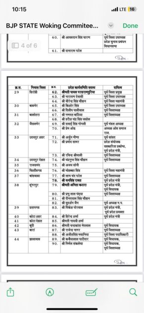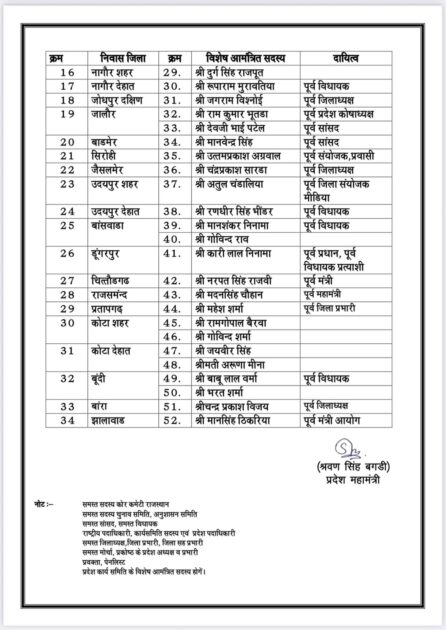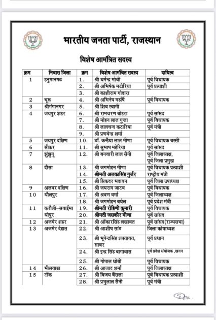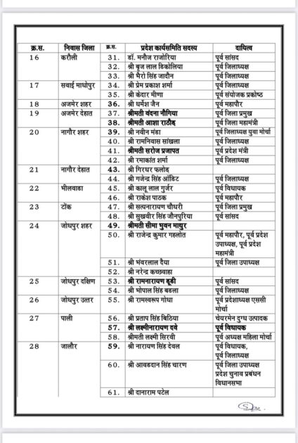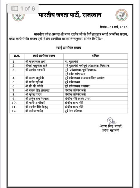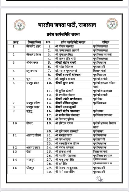 राजस्थान भाजपा से जुडी बड़ी खबर, भारतीय जनता पार्टी ने राजस्थान में संगठनात्मक मजबूती की दिशा में बड़ा कदम उठाते हुए प्रदेश कार्यसमिति की घोषणा की, नई कार्यसमिति में सीएम भजनलाल शर्मा, पूर्व सीएम वसुंधरा राजे, अशोक परनामी, अरुण चतुर्वेदी, सतीश पूनियां, सीपी जोशी, गजेंद्र सिंह शेखावत, भूपेंद्र यादव, अर्जुन मेघवाल, भागीरथ चौधरी, रवनीत सिंह बिट्टू और राजेंद्र राठौड़ को बनाया गया स्थायी आमंत्रित सदस्य, वहीं सभी जिलों से संतुलित प्रतिनिधित्व देते हुए जयपुर, बीकानेर, श्रीगंगानगर, हनुमानगढ़, झुंझुनूं, सीकर, दौसा और भरतपुर सहित विभिन्न जिलों के नेताओं को भी किया गया शामिल, देखें किसे कौनसी मिली ज़िम्मेदारी