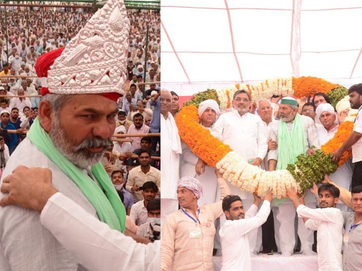 भारतीय किसान यूनियन के प्रवक्ता और किसान नेता राकेश टिकैत ने मंगलवार को झुंझुनूं के कर्बला मैदान में किसान महापंचायत के दौरान लोगों को संबोधित किया. यहां राकेश टिकैत का 51 किलो की कुल 101 मालाओं से स्वागत किया गया. इसके साथ ही चांदी का मुकुट भी टिकैत को पहनाया गया. इस दौरान सबसे पहले किसान महासभा के अमराराम और किसान यूनियन के महामंत्री चौधरी युद्ध वीर सिंह ने संबोधित किया.