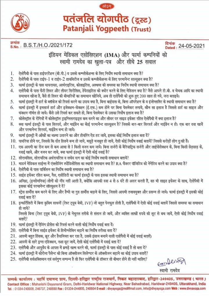 Politalks.News/Bharat. एलोपैथी को लेकर दिए विवादित बयान को स्वास्थ्य मंत्री के कहने के बाद भले ही योग गुरु रामदेव ने वापस ले लिया हो, लेकिन अगले दिन यानी सोमवार को रामदेव ने एक बार फिर एलोपैथी चिकित्सा पद्धति की प्रासंगिकता पर सवाल उठाते हैं. बाबा रामदेव ने इंडियन मेडिकल एसोसिएशन (IMA) और फार्मा कंपनियों को खुला खत लिखर 25 सवाल दागे हैं. रामदेव ने कहा कि एलौपैथी सर्वशक्तिमान और सर्वगुण संपन्न है तो फिर एलोपैथी के डॉक्टर तो बीमार नहीं होने चाहिए. वर्तमान में जारी कोरोना कोहराम का जिक्र करते हुए बाबा रामदेव ने कहा है कि फार्मा इंडस्ट्री में कोरोना मरीज को बिना ऑक्सीजन सिलेंडर के ऑक्सीजन बढ़ाने का कोई उपाय है तो बताएं? बाबा रामदेव ने बीपी, टाइप-1,टाइप-2 डायबिटीज, थायराइड जैसी कई बीमारियों को लेकर सवाल पूछा कि क्या उनके पास इनका स्थायी समाधान है.