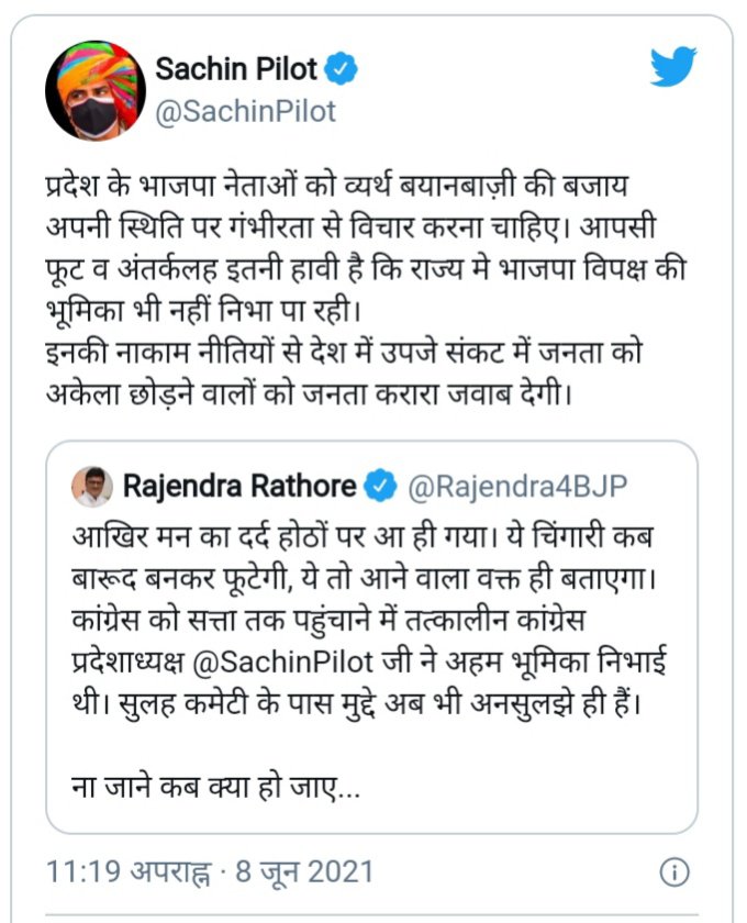 इससे पहले मंगलवार को मीडिया में सचिन पायलट का बयान आने के बाद उपनेता प्रतिपक्ष राजेंद्र राठौड़ ने ट्वीट करते हुए कहा था कि, "आखिर मन का दर्द होठों पर आ ही गया. ये चिंगारी कब बारूद बनकर फूटेगी, ये तो आने वाला वक्त ही बताएगा.