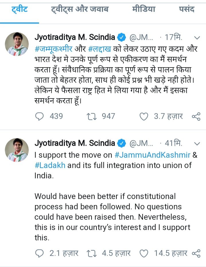 ज्योतिरादित्य सिंधिया ने जम्मूकश्मीर पुनर्गठन बिल का समर्थन का समर्थन पर ट्विट करते हुए लिखा – “जम्मूकश्मीर और #लद्दाख को लेकर उठाए गए कदम और भारत देश मे उनके पूर्ण रूप से एकीकरण का मैं समर्थन करता हूँ। संवैधानिक प्रक्रिया का पूर्ण रूप से पालन किया जाता तो बेहतर होता, साथ ही कोई प्रश्न भी खड़े नही होते। लेकिन ये फैसला राष्ट्र हित मे लिया गया है और मैं इसका समर्थन करता हूँ।”