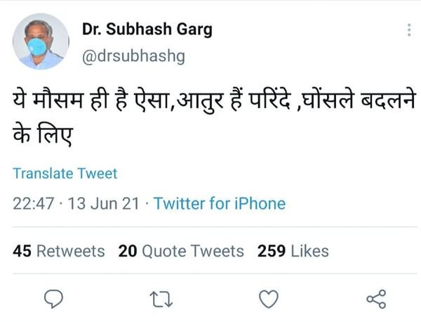 हालांकि मंत्री सुभाष गर्ग से जब इस ट्वीट के सियासी मायनों के बारे में पूछा गया तो गर्ग ने मीडिया से कहा कि, ‘मेरे यहां लॉन अच्छा है, आज मैं लॉन में बैठा था तो बहुत से परिंदे आ गए. गर्मी और बारिश के बीच का यह मौसम ऐसा होता है कि इसमें परिंदे कुछ अलग मिजाज में रहते हैं. मैंने उन परिंदों के के मिजाज को देखकर ही ट्वीट किया है, बाकी आप मतलब निकालने के लिए स्वतंत्र हैं.’ अब मंत्री जी से यह कौन पूछे कि देर रात कौनसे परिंदे मंत्री जी के लॉन में आ गए.
