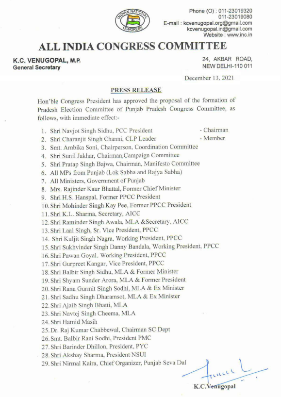 पंजाब में सत्ताधारी कांग्रेस पार्टी ने विधानसभा चुनाव 2022 की तैयारियां तेज कर दी हैं. कांग्रेस ने पंजाब के 28 जिलों में जिला कांग्रेस कमेटियों के अध्यक्षों और कार्यकारी अध्यक्षों की नियुक्तियां भी पंजाब प्रदेश कांग्रेस कमेटी की प्रदेश चुनाव समिति के गठन के साथ ही कर दिया है. कांग्रेस महासचिव केसी वेणुगोपाल ने जानकारी देते हुए बताया कि मुख्यमंत्री चरणजीत सिंह चन्नी को चुनाव समिति का सदस्य बनाया गया है. जबकि वरिष्ठ नेता अंबिका सोनी को समन्वय समिति का अध्यक्ष और सुनील जाखड़ को प्रचार समिति की कमान सौंपी गई है. पार्टी ने वरिष्ठ नेता प्रताप सिंह बाजवा को घोषणा पत्र समिति का अध्यक्ष बनाया है. वेणुगोपाल ने बताया कि प्रदेश कांग्रेस के पूर्व अध्यक्ष राजेंद्र कौर भट्ठल, एचएस हंसपाल तथा महेंद्र सिंह को समिति का सदस्य बनाया गया है. इसके अलावा राज्यसभा तथा लोकसभा में पार्टी के सदस्यों के साथ ही राज्य सरकार के मंत्रियों को भी समिति में जगह दी गई है.