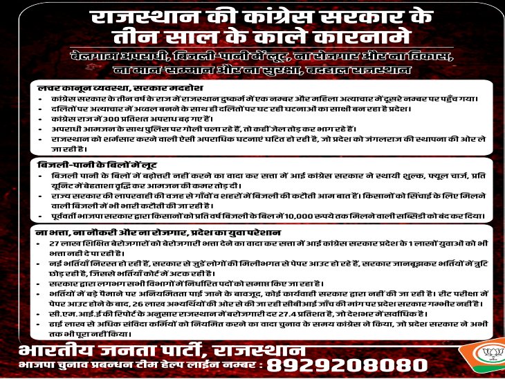 वहीं बैठक के बाद प्रदेश भाजपा ने धरियावद और वल्लभनगर उपचुनाव को देखते हुए राज्य सरकार के तीन साल के शासन में बेरोजगारी, भ्रष्टाचार, कानून-व्यवस्था, बिजली-पानी सहित विभिन्न जनहित के मुद्दों को लेकर ब्लैक पेपर जारी किया था. भाजपा इन्हीं सब मुद्दों को लेकर लेकर 25 से 30 नवम्बर तक कलेक्ट्रेट का घेराव करेगी.