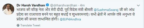 केंद्रीय मंत्री स्वास्थ्य और परिवार कल्याण मंत्री डॉ. हर्षवर्धन के इस ट्वीट में लिखा था, ‘भाजपा की वरिष्ठ नेता और मेरी दीदी, पूर्व विदेश मंत्री श्रीमती सुषमा स्वराज को आंध्र प्रदेश का राज्यपाल बनने पर बहुत बधाई व शुभकामनाएं. सभी क्षेत्रों में आपके अनुभव से राज्य की जनता लाभान्वित होगी.’