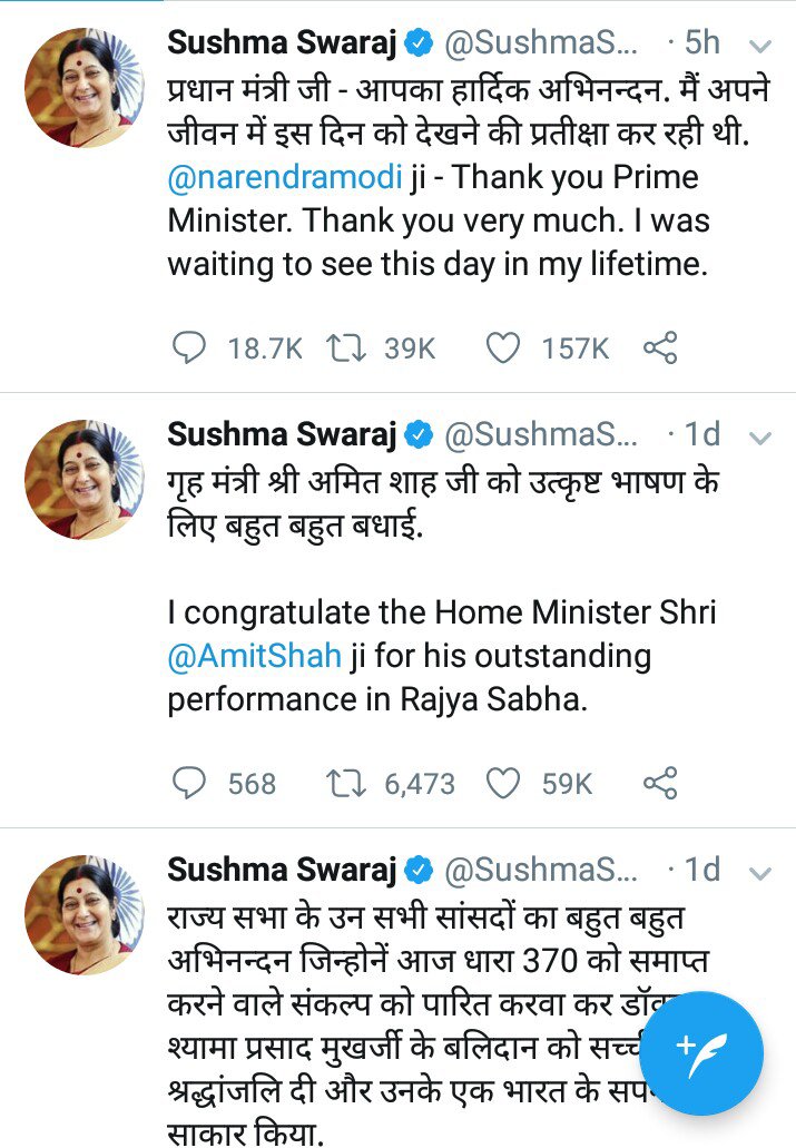 लम्बे समय से खराब स्वास्थ्य के चलते सुषमा स्वराज ने इस बार का लोकसभा चुनाव नहीं लड़ने का निर्णय किया था. सुषमा स्वराज की गिनती प्रखर नेताओं में होती थी. जब साल 2014 में केंद्र में मोदी सरकार बनी तब उनके राजनीतिक अनुभव को देखते हुए उन्हें विदेश मंत्रालय की अहम जिम्मेदारी दी गई. निधन के कुछ घंटे पहले ही उन्होंने अनुच्छेद 370 खत्म करने के फैसले पर ट्विट कर केंद्र सरकार की तारीफ करते हुए प्रधानमंत्री नरेन्द्र मोदी को बधाई दी थी.
