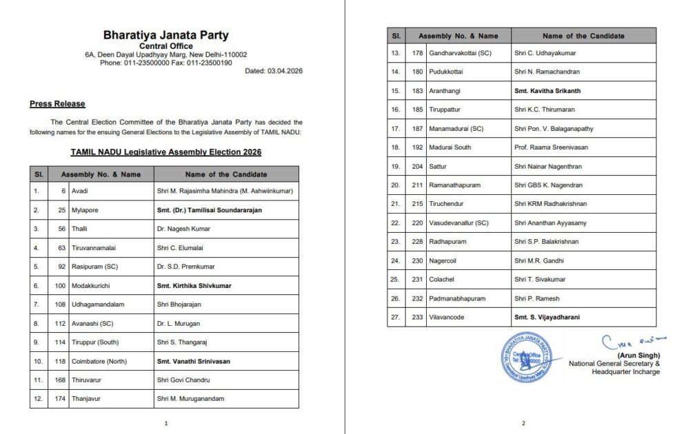 तमिलनाडु विधानसभा चुनाव से जुडी बड़ी खबर, BJP ने तमिलनाडु चुनाव के लिए 27 उम्मीदवारों के नामों का किया ऐलान, डॉ. तमिलिसाई सुंदरराजन मायलापुर से लड़ेंगे चुनाव, वनाठी श्रीनिवासन-कोयंबटूर (नॉर्थ) से उम्मीदवार, डॉ. एल. मुरुगन—अवनाशी (SC) सीट से चुनाव लड़ेंगे, राज्य में 23 अप्रैल को 234 विधानसभा क्षेत्रों के लिए एक ही चरण में होंगे चुनाव, मतगणना 4 मई को होगी, देखें पूरी लिस्ट