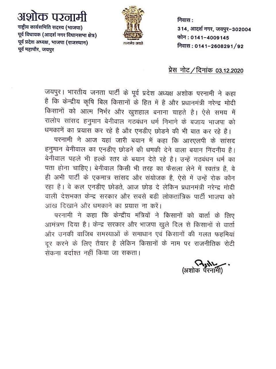 अशोक परनामी ने कृषि बिलों का विरोध करने पर साधा हनुमान बेनीवाल पर निशाना लेकिन मैडम राजे के लिए बेनीवाल के बयानों पर नहीं बोला एक शब्द भी: भाजपा के पूर्व प्रदेशाध्यक्ष अशोक परनामी ने साधा सांसद हनुमान बेनीवाल पर निशाना, कहा- ‘बेनीवाल अपनी पार्टी के एकमात्र सांसद और संयोजक हैं, उन्हें एनडीए छोड़ने से रोक कौन रहा है, बेनीवाल कल एनडीए छोड़ते आज छोड़ दें, लेकिन प्रधानमंत्री नरेन्द्र मोदी वाली देशभक्त केन्द्र सरकार और सबसे बडी लोकतांत्रिक पार्टी भाजपा को आंख दिखाने और धमकाने का प्रयास ना करें, बेनीवाल पहले भी हल्के स्तर के बयान देते रहे हैं, उन्हें गठबंधन धर्म का पता होना चाहिए, केन्द्रीय कृषि बिल हैं किसानों के हित में, और पीएम मोदी चाहते हैं किसानों को आत्म निर्भर और खुशहाल बनाना, ऐसे समय में सांसद हनुमान बेनीवाल गठबंधन धर्म निभाने के बजाय भाजपा को धमकाने का कर रहे हैं प्रयास,’