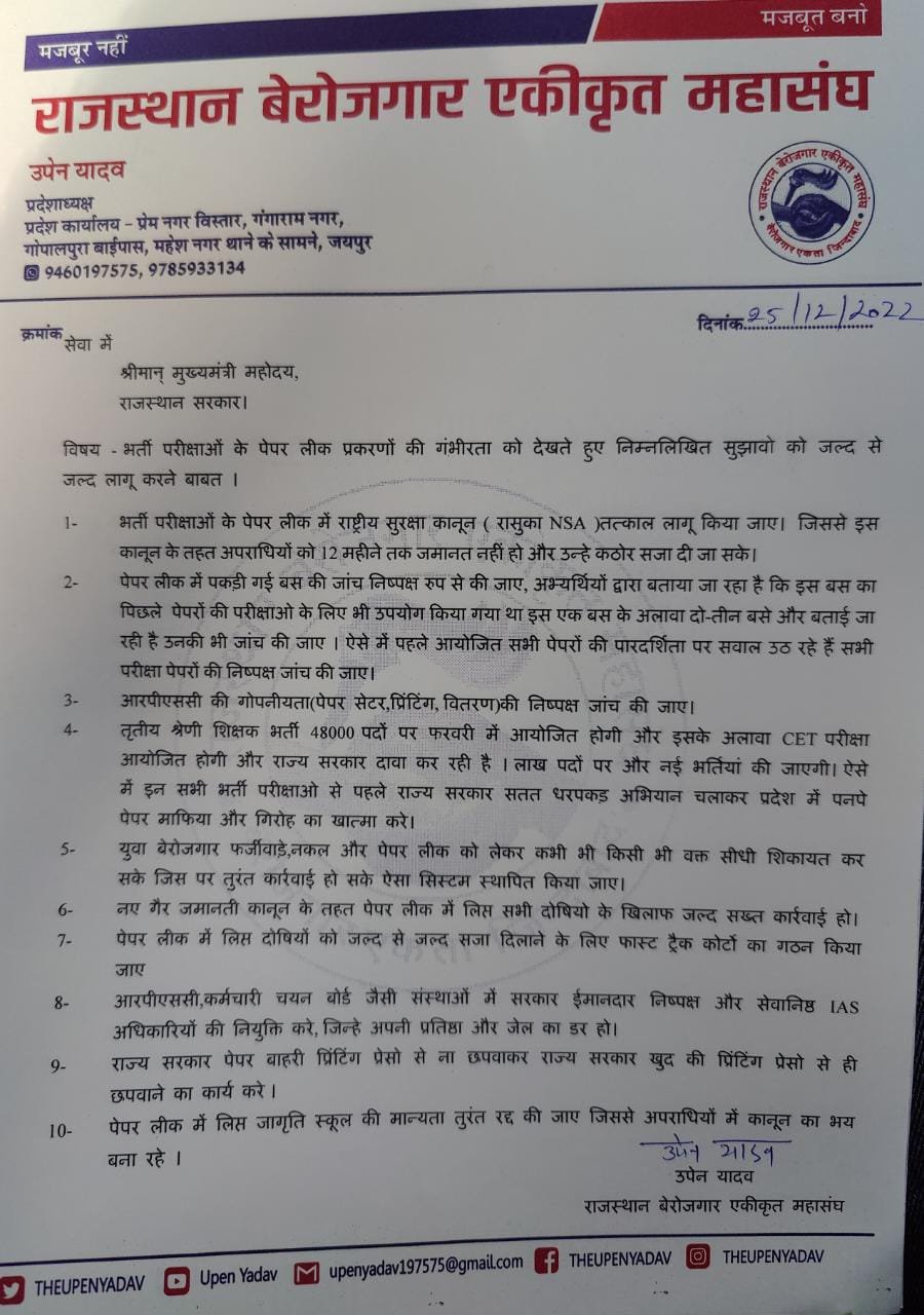• भर्ती परीक्षाओं के पेपर लीक में राष्ट्रीय सुरक्षा कानून ( रासुका NSA ) तत्काल लागू किया जाए. इस कानून के तहत अपराधियों को 12 महीने तक जमानत नहीं हो. इसके साथ ही दोषियों को कठोर सजा दी जाए.