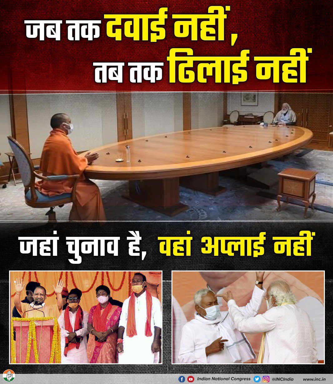जहां पर चुनाव है वहां पर कोरोना का कोई डर नहीं है'. कांग्रेस के इस ट्वीट को देखकर लगता तो यही है कि भाजपा इस रणनीति के तहत काम कर रही है. कांग्रेस द्वारा टैग की गई फोटो में योगी आदित्यनाथ और पीएम मोदी कोरोना प्रोटोकॉल का पालन करते हुए एक दूसरे से काफी दूर बैठे हैं और ये बता रहे हैं कि कोरोना से बचने के लिए उचित दुरी जरुरी है. लेकिन शायद बीजेपी के तमाम दिग्गज नेता ये भूल जाते हैं कि जहां जहां चुनाव होने हैं या हुए हैं, क्या वहां पर कोरोना का कोई डर नहीं.