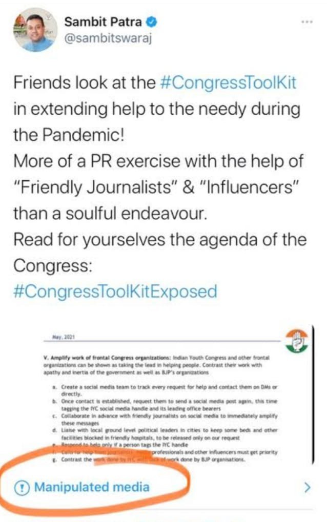 कांग्रेस पार्टी की शिकायत के बाद ट्विटर ने अपनी जांच में संबित पात्रा के ट्वीट को 'मैनुपुलेटेड मीडिया' कैटेगरी में मार्क किया है. जिसके तहत ट्वीटर ने संबित पात्रा के इस ट्वीट के नीचे