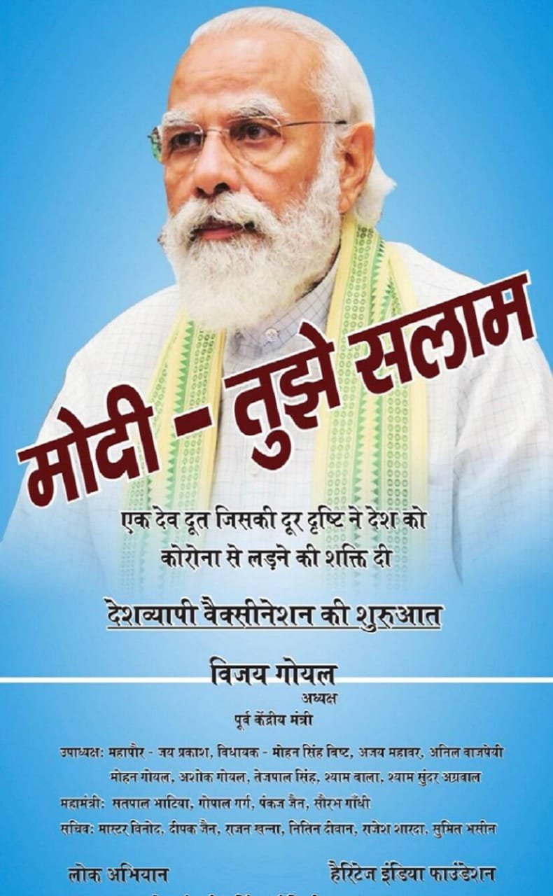 Politalks.News/NewDelhi. 16 जनवरी से देश भर में शुरू होने वाले कोरोना टीकाकरण अभियान से पहले ही बीजेपी नेताओं ने इसका पूरा श्रेय प्रधानमंत्री नरेन्द्र मोदी को देते हुए उनका प्रचार-प्रसार शुरू कर दिया है. जहां अन्य नेता कोरोना वैक्सीन को लेकर पीएम मोदी की अपने भाषणों में प्रशंसा करते दिख रहे हैं, वहीं पूर्व केंद्रीय मंत्री और दिल्ली के चांदनी चौक से भाजपा के पूर्व सांसद विजय गोयल एक कदम ओर आगे निकल गए हैं. विजय गोयल ने कई अखबारों में शुक्रवार के अंक में एक पूरे पेज का विज्ञापन दिया है जिसमें पीएम मोदी के पोस्टर के नीचे लिखा हुआ है '