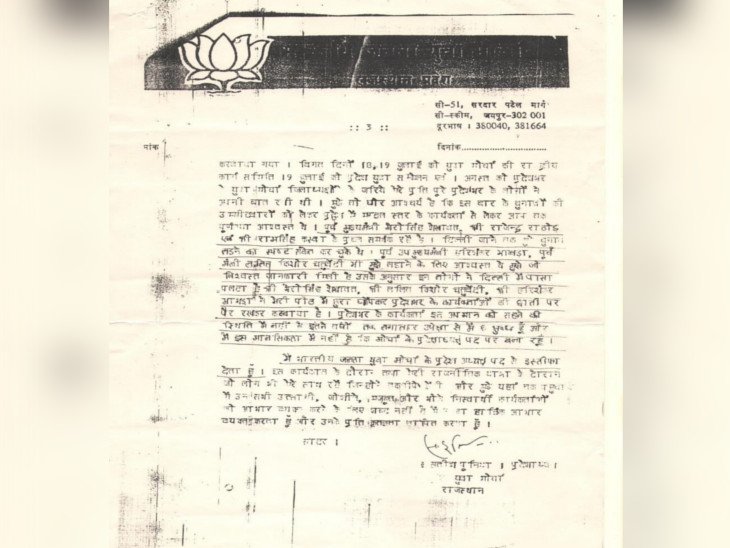 दरअसल, तत्कालीन भाजयुमो प्रदेशाध्यक्ष सतीश पूनियां ने अपना इस्तीफा देते हुए गुलाबचंद कटारिया को लिखा था कि, "युवा मोर्चा जिलाध्यक्षों के जरिए मेरे प्रति पूरे प्रदेशभर के लोगों ने अपनी बात रखी थी. मुझे तो घोर आश्चर्य है कि इस बार के चुनाव के उम्मीदवारों को लेकर प्रदेश में मंडल स्तर से बड़े स्तर के कार्यकर्ता से लेकर आप तक पूरी तरह आश्वस्त थे. पूर्व मुख्यमंत्री भैरो सिंह शेखावत, राजेंद्र राठौड़ और राम सिंह कसवा के प्रबल समर्थक रहे हैं. शेखावत दिल्ली जाने तक मुझे चुनाव लड़ने का स्पष्ट संकेत दे चुके थे. पूर्व उप मुख्यमंत्री हरिशंकर भाभड़ा, पूर्व मंत्री ललित किशोर चतुर्वेदी भी मुझे लड़ाने के लिए आश्वस्त किया था. लेकिन, मुझे जो विश्वस्त जानकारी मिली है उसके अनुसार इन लोगों ने दिल्ली में पासा पलटा.
