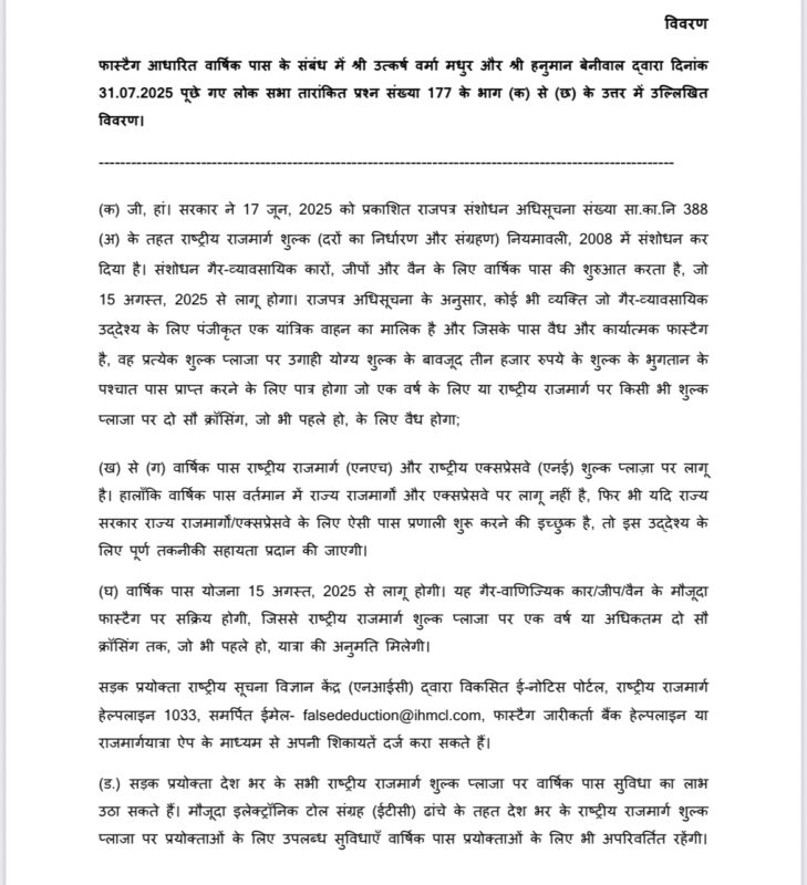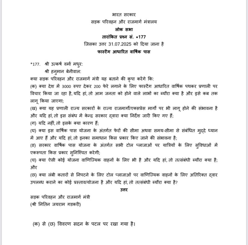 नागौर सांसद हनुमान बेनीवाल का बयान, सांसद बेनीवाल ने सड़क,परिवहन एवं राजमार्ग मंत्रालय द्वारा 3000 रुपए लेकर शुरू की जा रही वार्षिक टोल व्यवस्था के संदर्भ में पूछा प्रश्न, जिसका लिखित जवाब केंद्रीय मंत्री नितिन गडकरी ने दिया, वही सांसद हनुमान बेनीवाल ने कहा- सरकार की इस नीति में आम जनता और परिवहन क्षेत्र के साथ स्पष्ट भेदभाव हो रहा है,यह योजना केवल निजी (गैर-व्यावसायिक) वाहनों तक सीमित है और इसमें वाणिज्यिक वाहनों जैसे टैक्सी, ट्रक और बसों को शामिल नहीं किया गया है, जबकि सबसे अधिक टोल इन्हीं से वसूला जाता है, इस योजना से सरकार खुद की पीठ जरूर थपथपा रही है मगर छोटे व्यापारियों, किसानों और रोजमर्रा का सफर करने वाले लाखों वाहन चालकों के हितों की तरफ सरकार ने ध्यान ही नहीं दिया है, बेनीवाल ने आगे कहा- यह योजना केवल केंद्र सरकार के अधीन राष्ट्रीय राजमार्गों और एक्सप्रेसवे तक सीमित है, जबकि राज्य सरकारों द्वारा संचालित टोल सड़कों पर इसे लागू करने की कोई ठोस योजना नहीं है इससे जिस लाभ की बात सरकार कर रही है वो केवल सीमित रह जाएगा, सांसद ने आगे कहा- इस योजना में एक और बड़ी खामी यह है कि इसमें वार्षिक पास पर केवल 200 क्रॉसिंग की सीमा तय की गई है, जो व्यावहारिक नहीं है और रोज यात्रा करने वालों पर अतिरिक्त बोझ डालेगी, अगर हम आंकड़ों पर गौर करेंगे तो यह तथ्य सामने आयेंगे कि विगत 10 वर्षों में टोल वसूली लगातार बढ़ी है, 2015-16 में जहां ₹17,000 करोड टोल वसूला गया था, वह 2024-25 तक ₹47,000 करोड़ तक पहुंच गया है, यानी लगभग तीन गुना वृद्धि हुई है लेकिन इसके बावजूद सड़कों की हालत जगह-जगह खराब है और कई स्थानों पर मंत्री जी की घोषणा के बावजूद 60 किलोमीटर से भी कम दूरी में दो-दो टोल प्लाजा अब भी संचालित हो रहे है, सांसद बेनीवाल ने मांग करते हुए कहा- मेरी सरकार से मांग है कि वार्षिक पास योजना को सभी टोल सड़कों पर लागू किया जाए, वाणिज्यिक वाहनों को भी इसका हिस्सा बनाया जाए, और टोल दरों व दूरी की नीति में पारदर्शिता और व्यावहारिकता लाई जाए। एक तरफ जब डिजिटल इंडिया के तहत हर चीज आसान बनाने की बात हो रही है तो दूसरी तरफ एक ईमानदार टैक्सी ड्राइवर, पिक अप और कैम्पर चलाने वाले व्यक्ति को हर रोज चार बार टोल क्यों चुकाना पड़ता है, क्या यही न्याय है ?